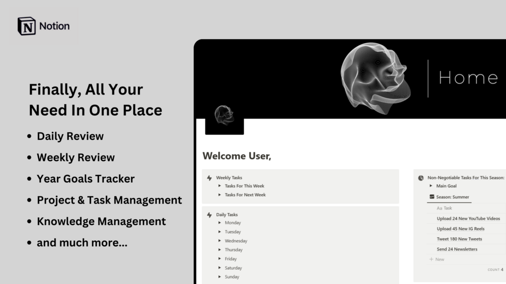 Notion Master Template is the best notion template ever created to help you organize your life, from capturing your notes to completing your tasks & projects, and resources, ALL in one place.